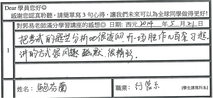 20145月中國科大◎多益聽說讀寫滿分講座◎感謝兩岸眾多同學評語:Perfect完美/非常激情/題型分析透徹相當有助高分/方法好多種馬上記起來/聽一場講座勝作幾百套題/讓我激發熱情/很愛老師的演講/還想上郭易老師的課