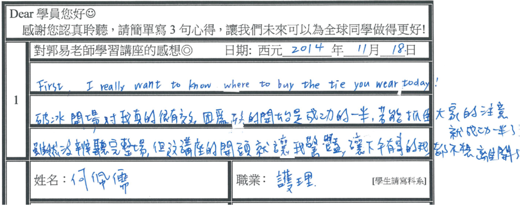 [感謝] 11月【全方位中英簡報技巧】ADP講座 滿場 學員感想: 希望所有老師上課都能跟你一樣/the best/犧牲期中考準備來聽非常值得/能來真是太幸運了/完全打破我的成見/每句話都是經典/聽郭易老師一場勝千場無聊演講!