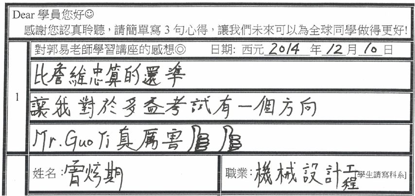 感謝郭易老師12月份【多益聽說讀寫全滿分】數百位碩博士學員感想:世界第一!/完全不同於其他老師/驚為天人嘆為觀止/名不虛傳最棒的考試方法//很高興臺灣有你這樣的老師幫助台灣/句句都是精華/竟然有十種口音/讓我重燃熱情跟希望/Perfect完美