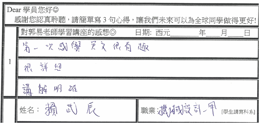 感謝郭易老師12月份【多益聽說讀寫全滿分】數百位碩博士學員感想:世界第一!/完全不同於其他老師/驚為天人嘆為觀止/名不虛傳最棒的考試方法//很高興臺灣有你這樣的老師幫助台灣/句句都是精華/竟然有十種口音/讓我重燃熱情跟希望/Perfect完美