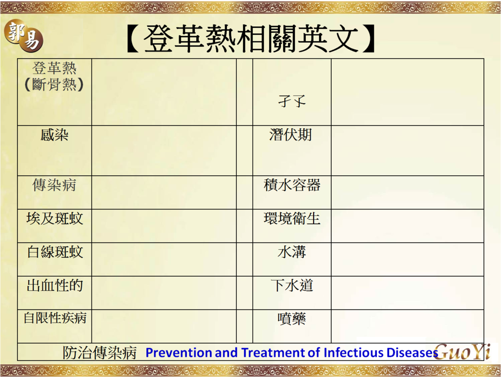 [重要] 郭易老師教你超越所有字典變身英文倉頡:登革熱的多種英文?孑孓的英文? 埃及斑蚊&白線斑蚊? 登革熱症狀跟防治資源&祝大家身體健康蚊子死光!