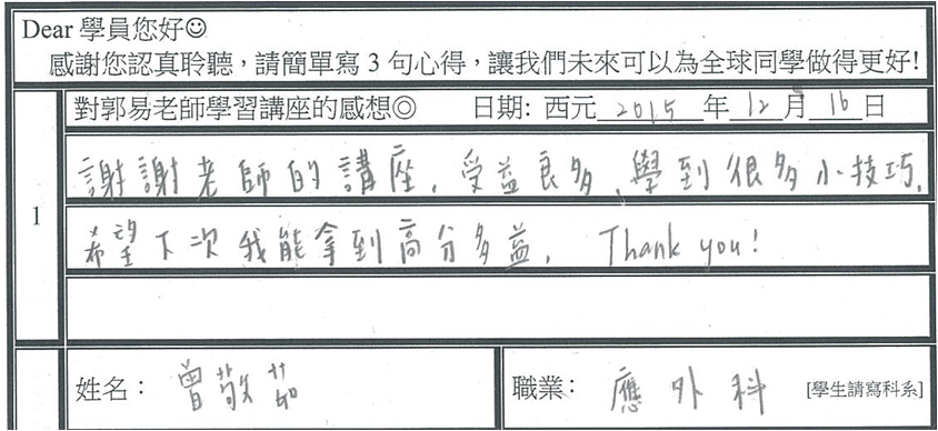 [最新] 201512月郭易老師學術講座 感謝[台中家商]全校師生感想◎以前從沒聽過這樣的演講/平常學不到的技巧/不只多益更是任何考試重點/太精采了非常嚴謹紮實的學問/覺得人生又有希望/非常令人有想上課的衝動/還有24小時價值7500的多益快閃活動來了!