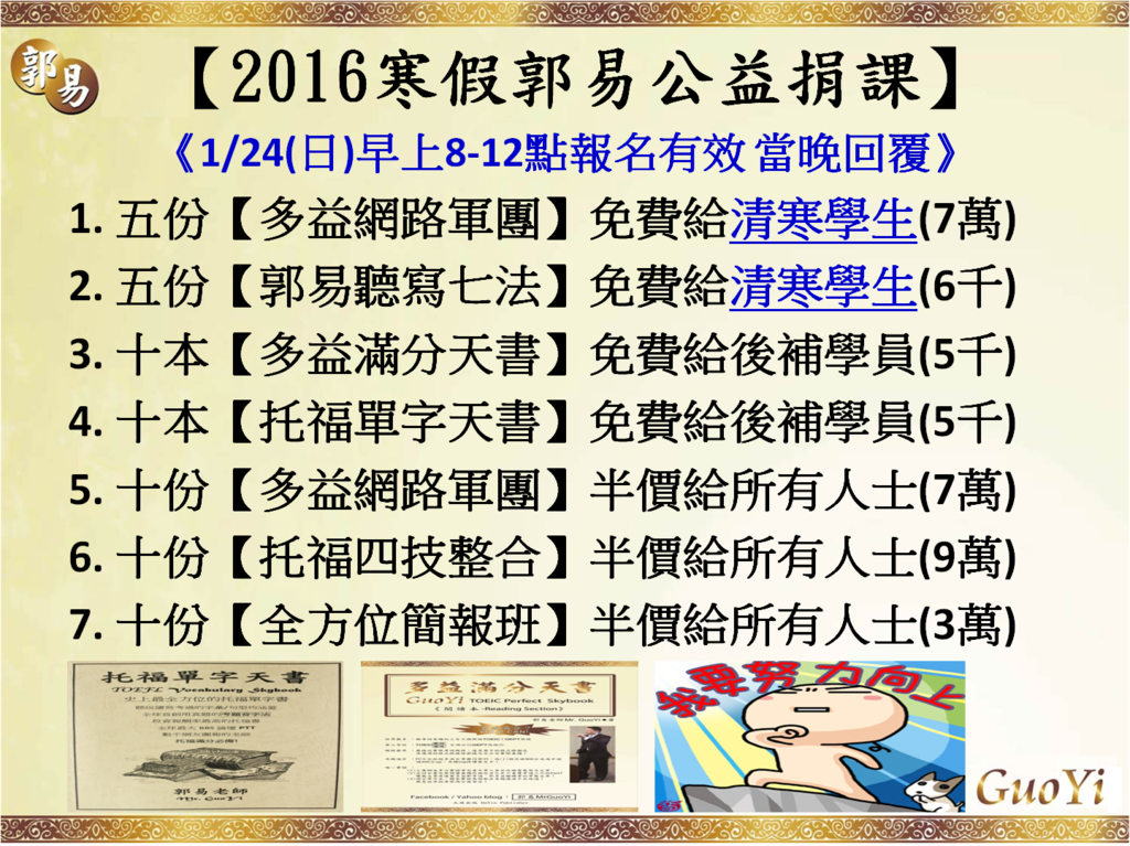 <重要>【2016寒假郭易公益捐課活動】 本次捐贈60份28萬的郭易學堂課程, 1/24(日)當早報名,捐贈有限愛心無限 跟著郭易老師一起寒冬送溫暖:) (隨時更新)