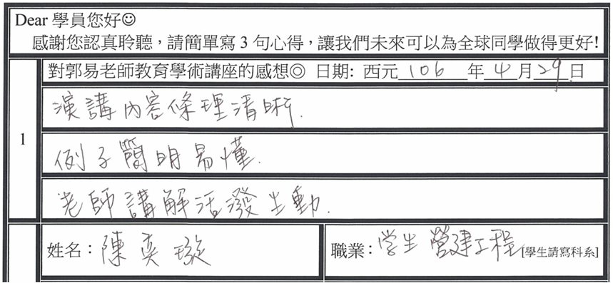 20170429感謝臺科大全校師生對郭易老師學術講座手寫感想:十分有用/很有系統/激勵人心/很有吸引力/不同以往課程/顛覆印像/翻轉思維/希望還有機會聽到您的演講!