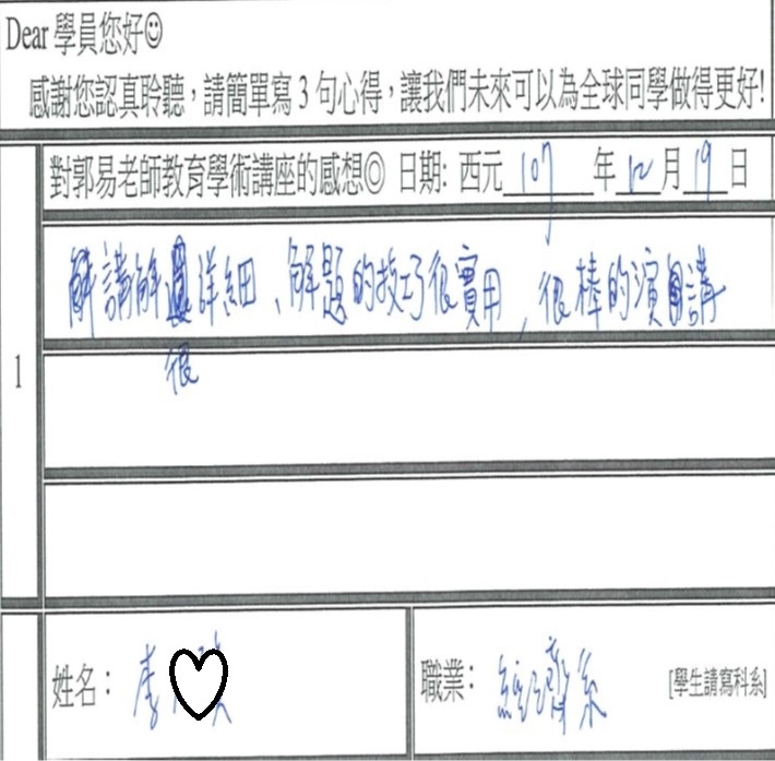 12月郭易老師@台北大學學術講座感謝師生手寫感想◎從沒聽過非常有啟發性/打破框架很震撼很有深度/很實用很多技巧/跟一般老師不一樣!