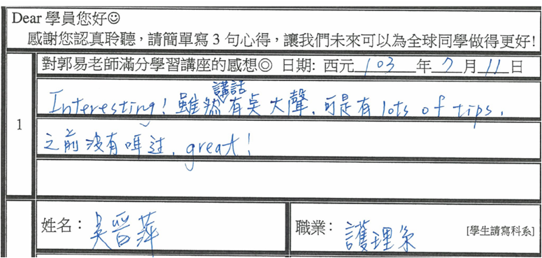 2014七月教育部主辦【郭易老師教你超越所有字典變身英文倉頡講座】感謝全國各地學生感想◎之前都沒看過的驚人教學/深受感動/我上過無數老師的課郭易老師讓我有全新感受/學到許多在學校無法得知的奧秘跟知識/非常學術詳細有條理/非常有用有趣收穫滿滿