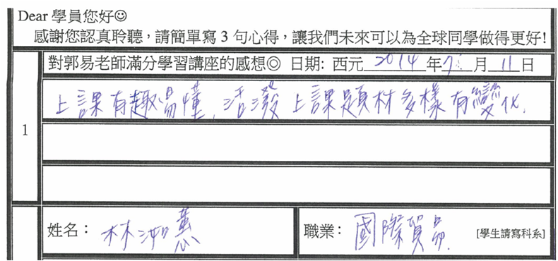 2014七月教育部主辦【郭易老師教你超越所有字典變身英文倉頡講座】感謝全國各地學生感想◎之前都沒看過的驚人教學/深受感動/我上過無數老師的課郭易老師讓我有全新感受/學到許多在學校無法得知的奧秘跟知識/非常學術詳細有條理/非常有用有趣收穫滿滿