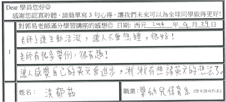 九月 臺北護大邀請◎郭易老師全球唯1的【多益聽說讀寫滿分全攻略】感謝同學評語;覺得很感動/第一次聽到這麼特別的課/第一次聽到有老師能有趣且仔細地解說考試關鍵/教學超精彩真的很厲害/讓我又重拾了信心/讓我又燃起了希望/希望老師每次都能來上課!