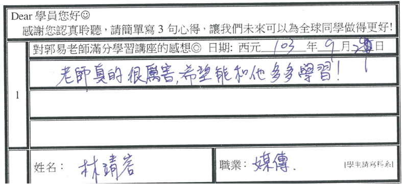 九月 臺北護大邀請◎郭易老師全球唯1的【多益聽說讀寫滿分全攻略】感謝同學評語;覺得很感動/第一次聽到這麼特別的課/第一次聽到有老師能有趣且仔細地解說考試關鍵/教學超精彩真的很厲害/讓我又重拾了信心/讓我又燃起了希望/希望老師每次都能來上課!