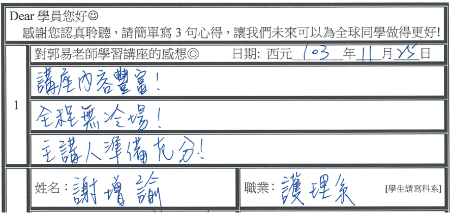 [感謝] 11月【全方位中英簡報技巧】ADP講座 滿場 學員感想: 希望所有老師上課都能跟你一樣/the best/犧牲期中考準備來聽非常值得/能來真是太幸運了/完全打破我的成見/每句話都是經典/聽郭易老師一場勝千場無聊演講!