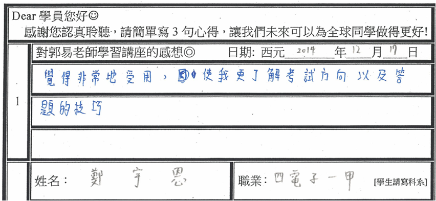 感謝郭易老師12月份【多益聽說讀寫全滿分】數百位碩博士學員感想:世界第一!/完全不同於其他老師/驚為天人嘆為觀止/名不虛傳最棒的考試方法//很高興臺灣有你這樣的老師幫助台灣/句句都是精華/竟然有十種口音/讓我重燃熱情跟希望/Perfect完美
