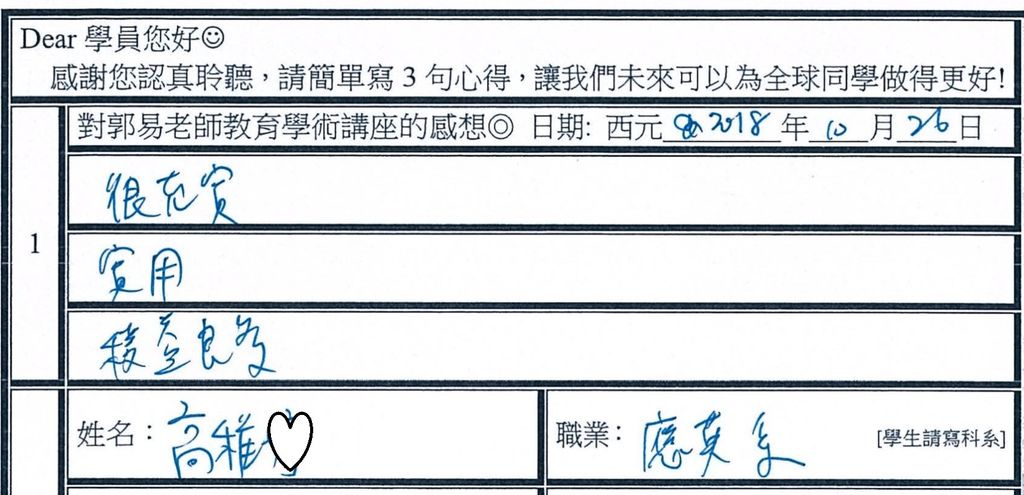 201710郭易老師@致理科大【多益滿分X英文倉頡字彙】講座,感謝百位英文系師生手寫感想:不同於一般學校補習班老師/很多第一次聽到/無法用言語表達我對郭易老師的admiration/充滿驚喜的活字典/聽完高中畢業後第一次想認真上進!/
