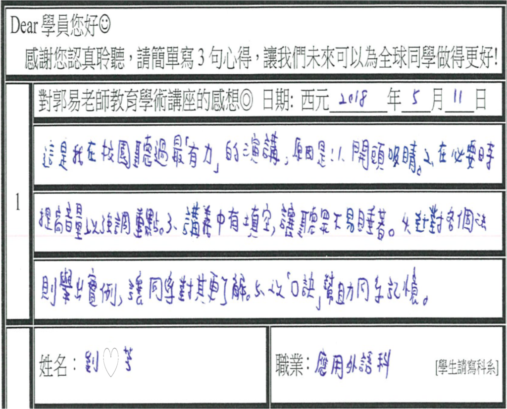 20180511郭易老師【全方位中英簡報技巧ADP講座】感謝臺中家商滿場熱情師生們感想◎打破以往成功簡報迷思/顛覆之前學過的所有技巧/高深學問精彩表演/很多意想不到細節跟技巧/看過最有力演講!
