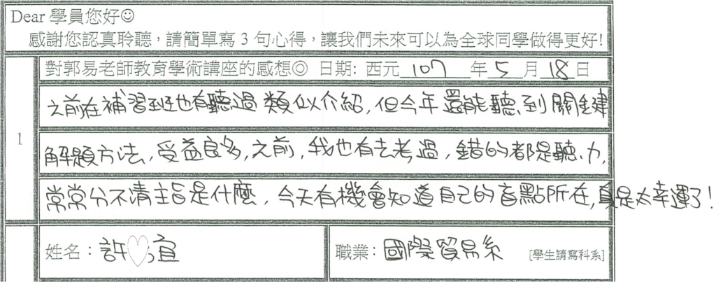 20180518郭易老師【新多益聽說讀寫全滿分】講座,感謝台中家商滿場師生手寫感想◎之前聽過別補習班,但今天聽到這場關鍵技巧解開盲點太幸運/超棒的以往不知道的技巧!/茅塞頓開很多不知道的撇步/希望參加郭易老師的多益班!