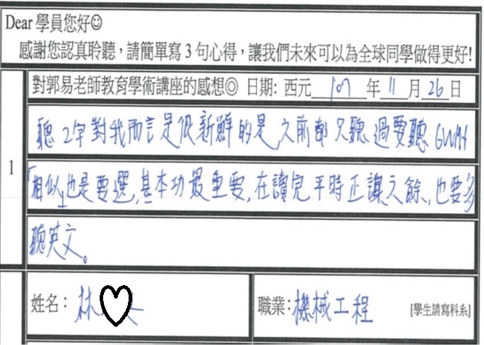 11月郭易老師@臺科大toeic聽說讀寫全滿分講座手寫感想◎沒聽過的全新觀點/非常實用生動有趣/其他課程書籍都沒聽過的技巧/激起我想考990跟學習衝動/振奮人心/讓人想上他的課!
