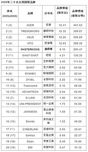 台灣宏碁、宏達電和台塑石化等三家企業也榜上有名;香港有五家公司進榜,中國移動的品牌估值達193.1億美元,位居香港公司榜首,全球排名第25;中國共18家企業榜上有名,中國建設銀行以170.9億美元的品牌估值名列第37名,為排行最高的中國企業。